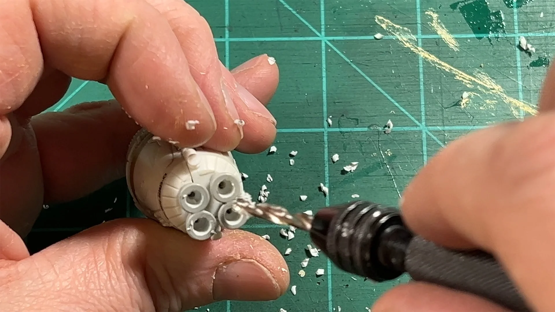 Thruster Modification: Holes for the thrusters were widened using a hand drill, and the thrusters were painted with dark silver paint to add depth.
